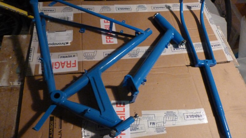 Bonjour, de retour après de l'inactivité : peinture des pièces du cadre. Les pièces sont revenues et je peux reprendre le montage. J'ai nettoyé les résidus de sablage dans le cadre au maximum. Pour la charnière un ami m'a réalisé une tige de 9mm de diamètre tournée à partir d'une tige filetée de 10mm. je le remercie de son aide.