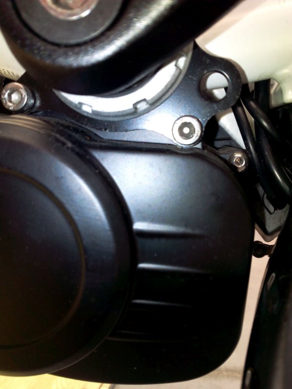 Velo InterSport équipé du TSDZ2. Photo reprise le 15-fev-22 Photo prise le 15-fev-22, gros plan sur la fixation insérée sous l'écrou du pédalier
