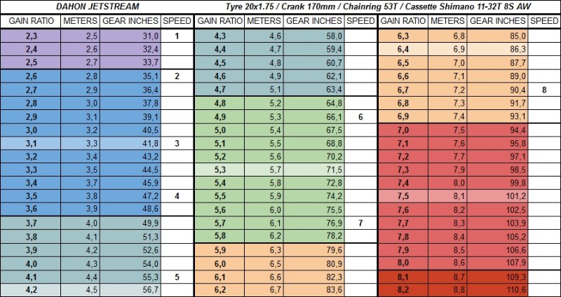 Afin que tous le monde parle la même langue je propose d'utiliser un tableau des développements rectifiés avec la formule de Sheldon Brown (prise en compte de la longueur de la manivelle). Il y a 6 plages de Gain que l'on peut regrouper en 3 parties.